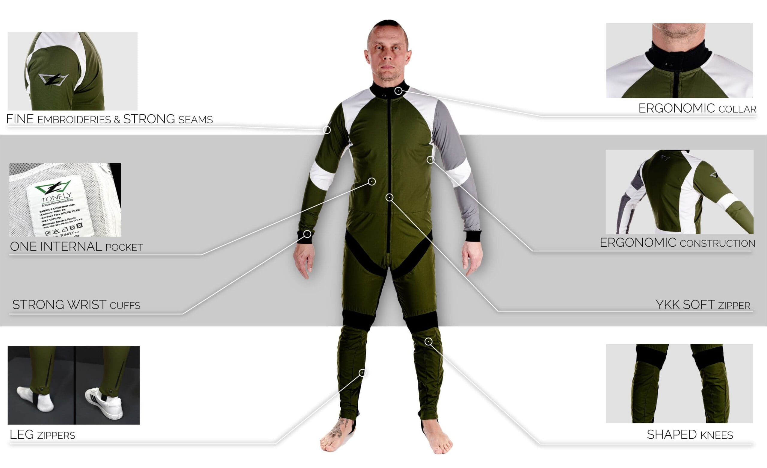 The lower legs are constructed with 6 panels and equipped with ankle zippers for easy wear while maintaining a snug, form-fitting fit.